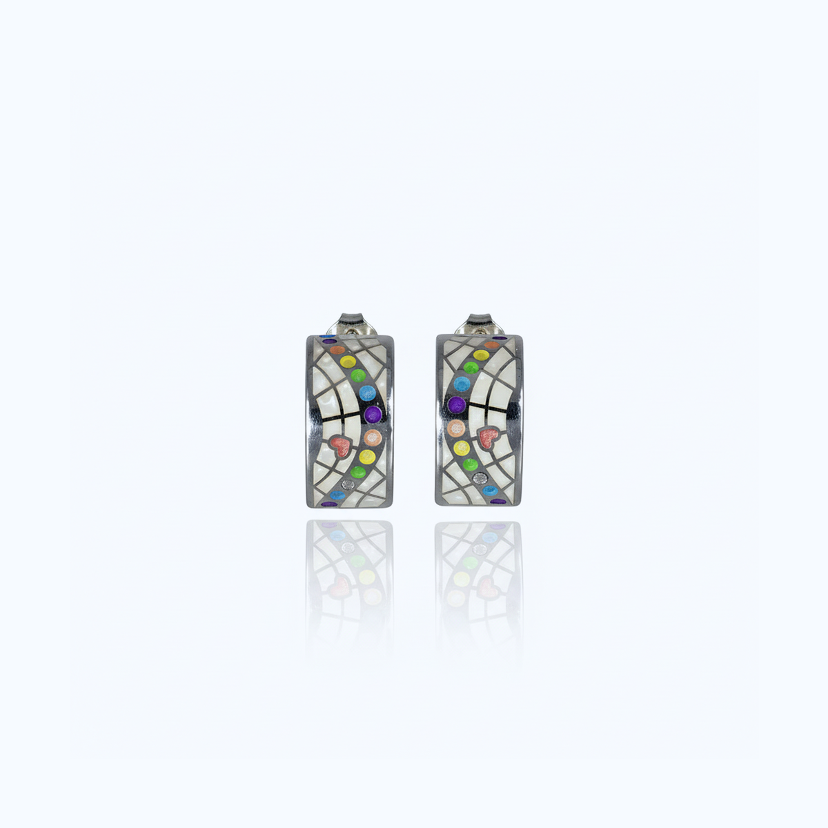 Chic huggie hoop earrings featuring a vibrant, multi-color mosaic enamel pattern with a modern wave design.